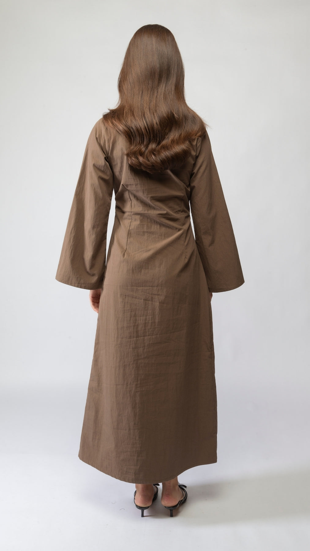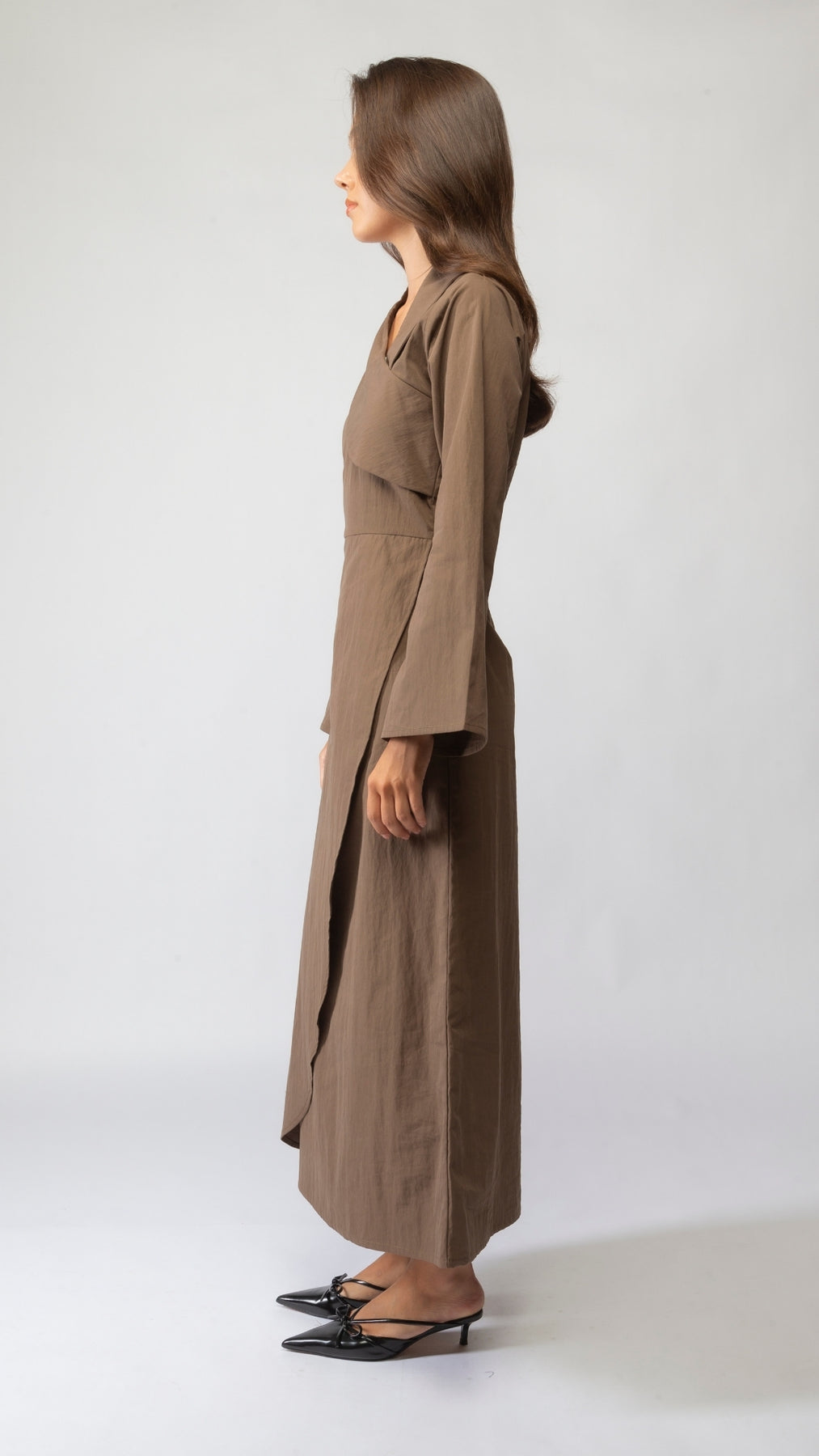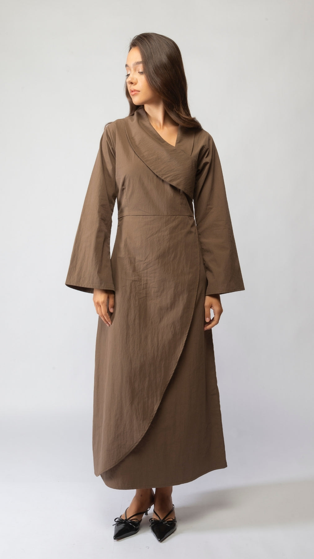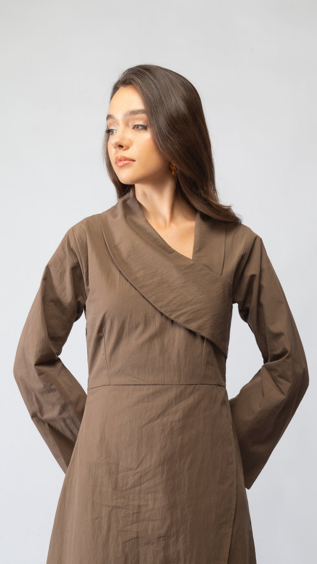 Description: A structured wrap dress with a statement draped collar, tailored in lightweight cotton for an effortlessly elegant silhouette.