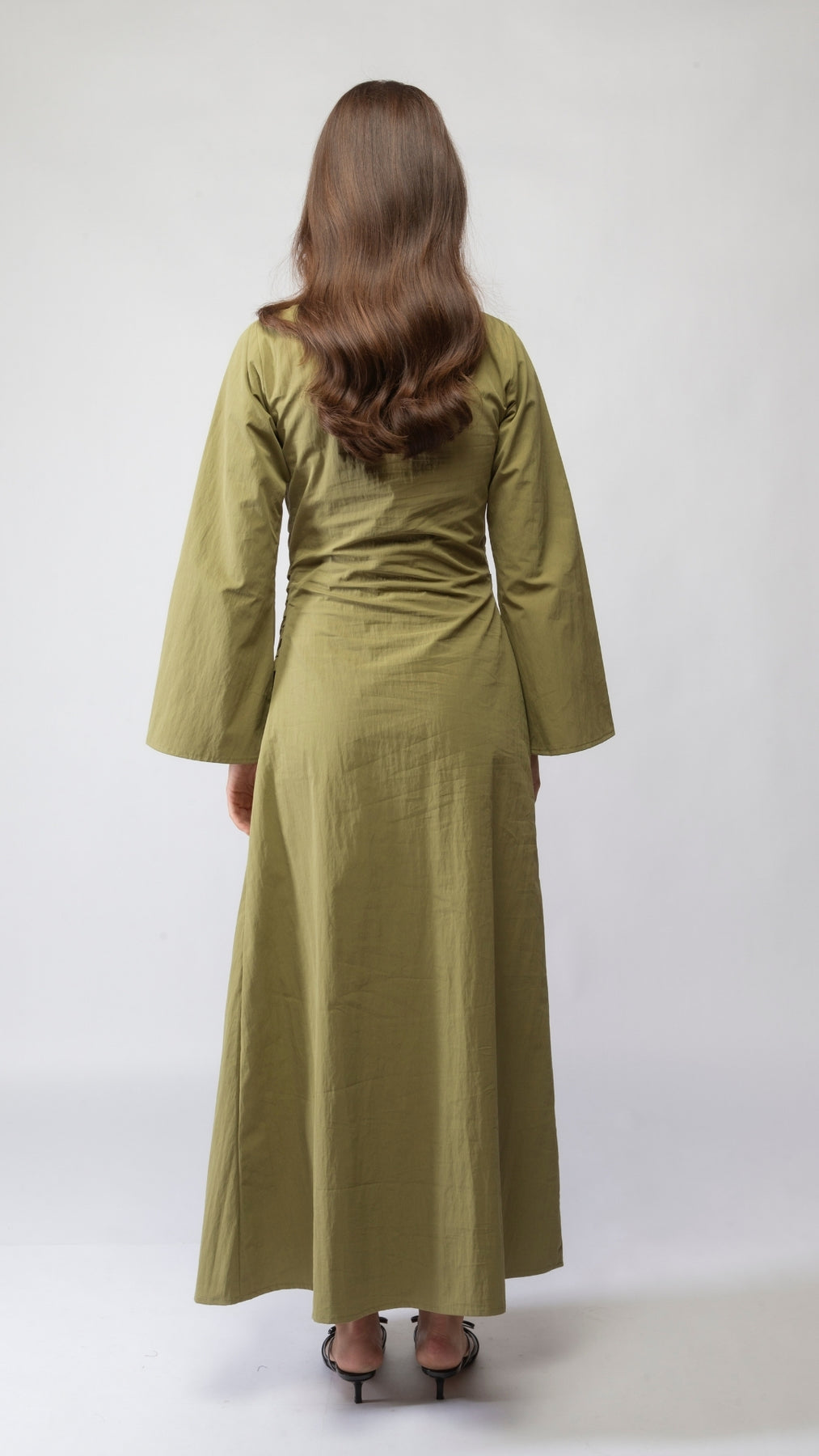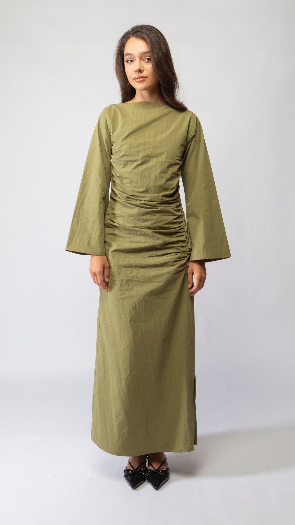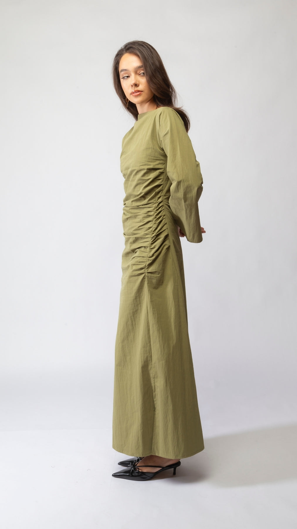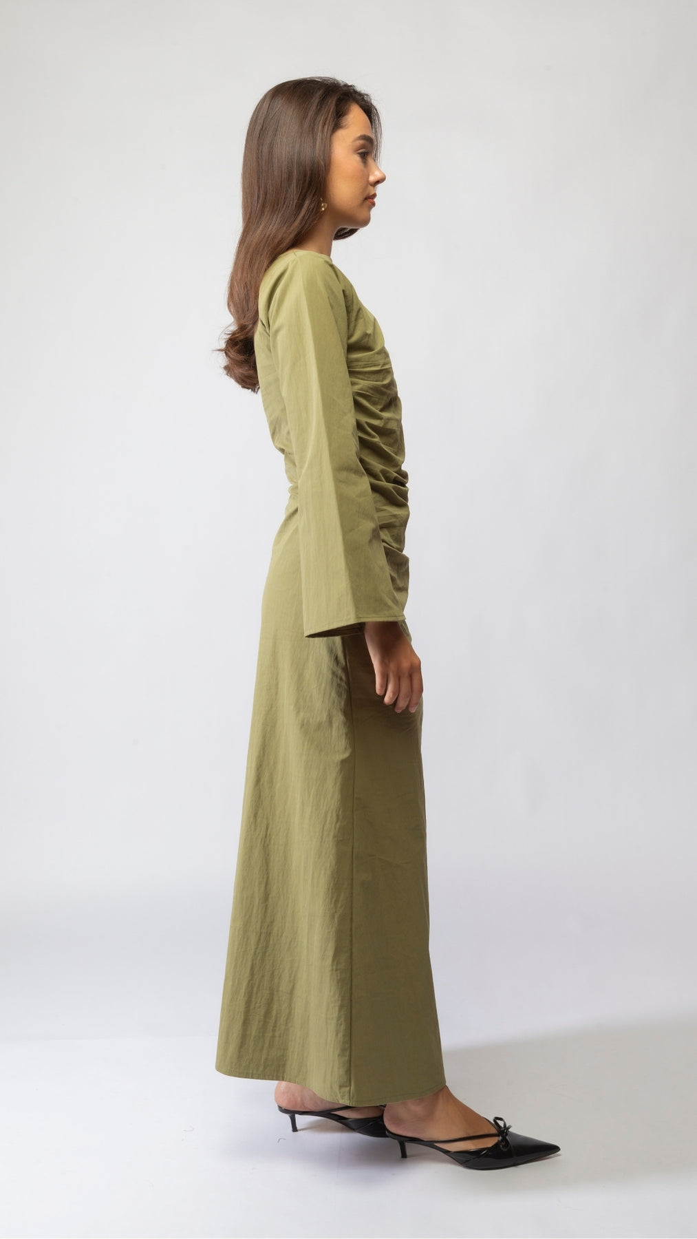 Description: A fitted long-sleeve dress in olive green featuring elegant side draping and soft ruching detail.