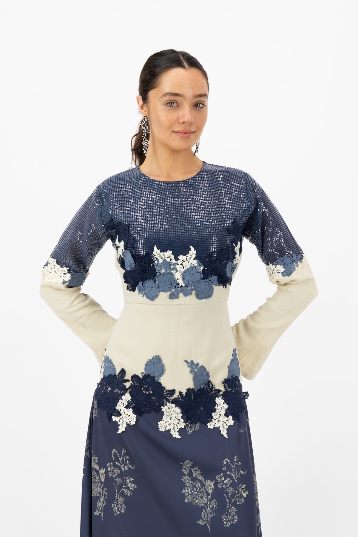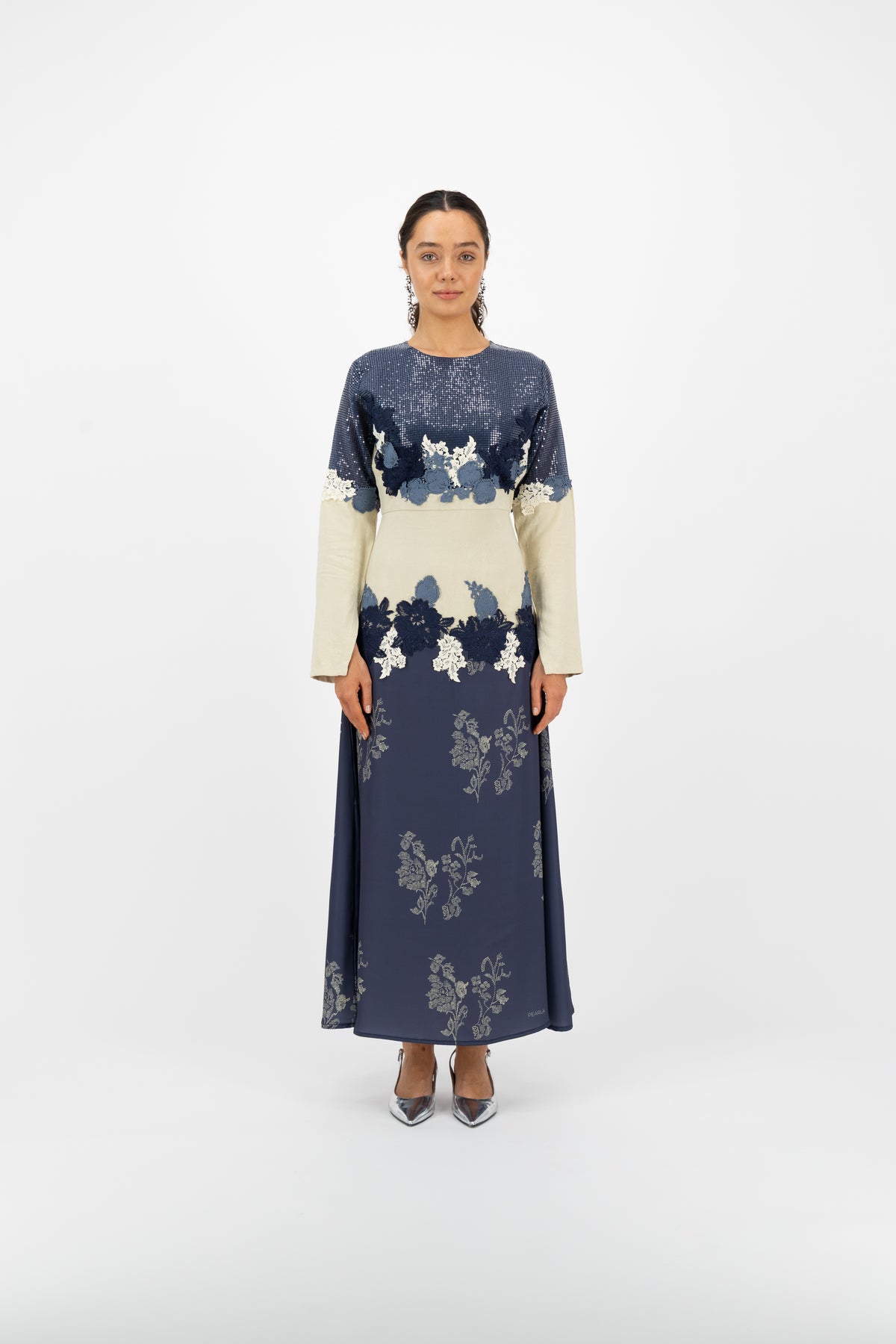 Description: Elegant floral lace dress in blue and ivory with a flowing, modest silhouette.
