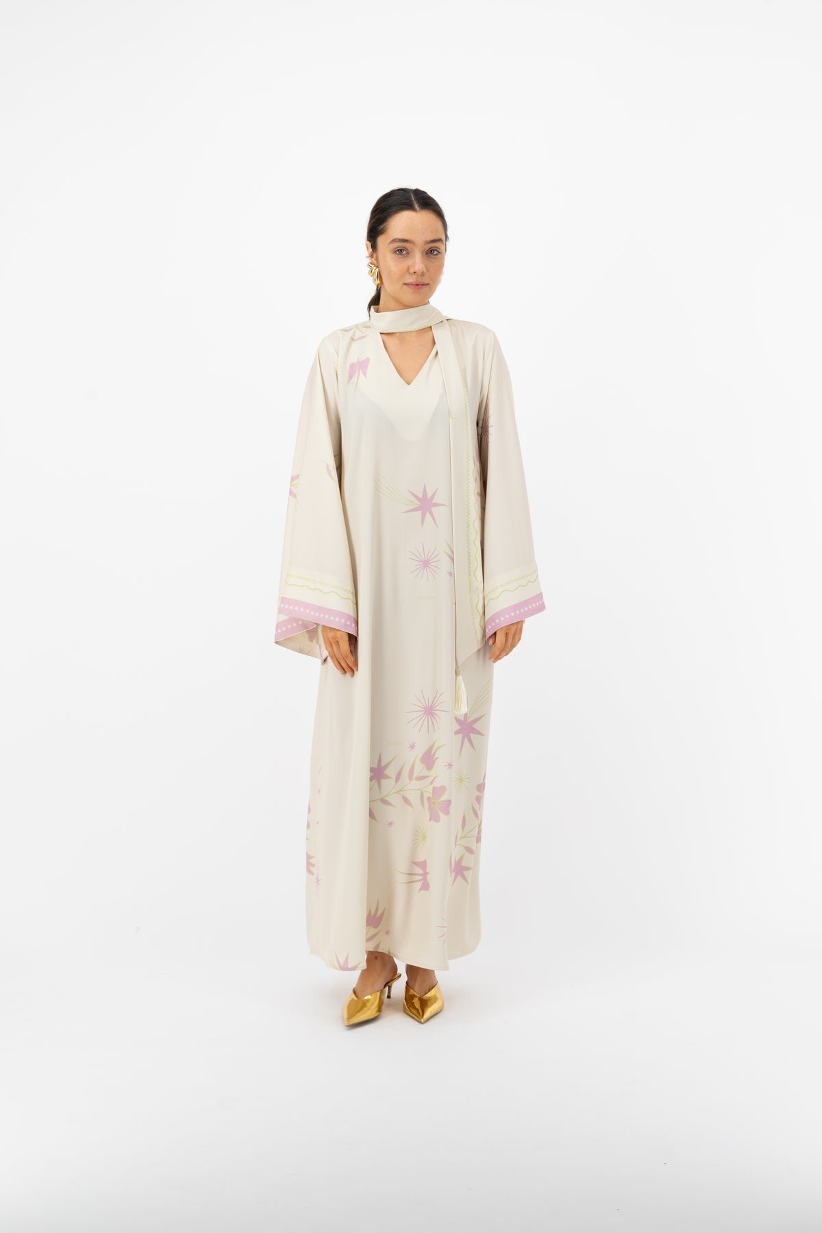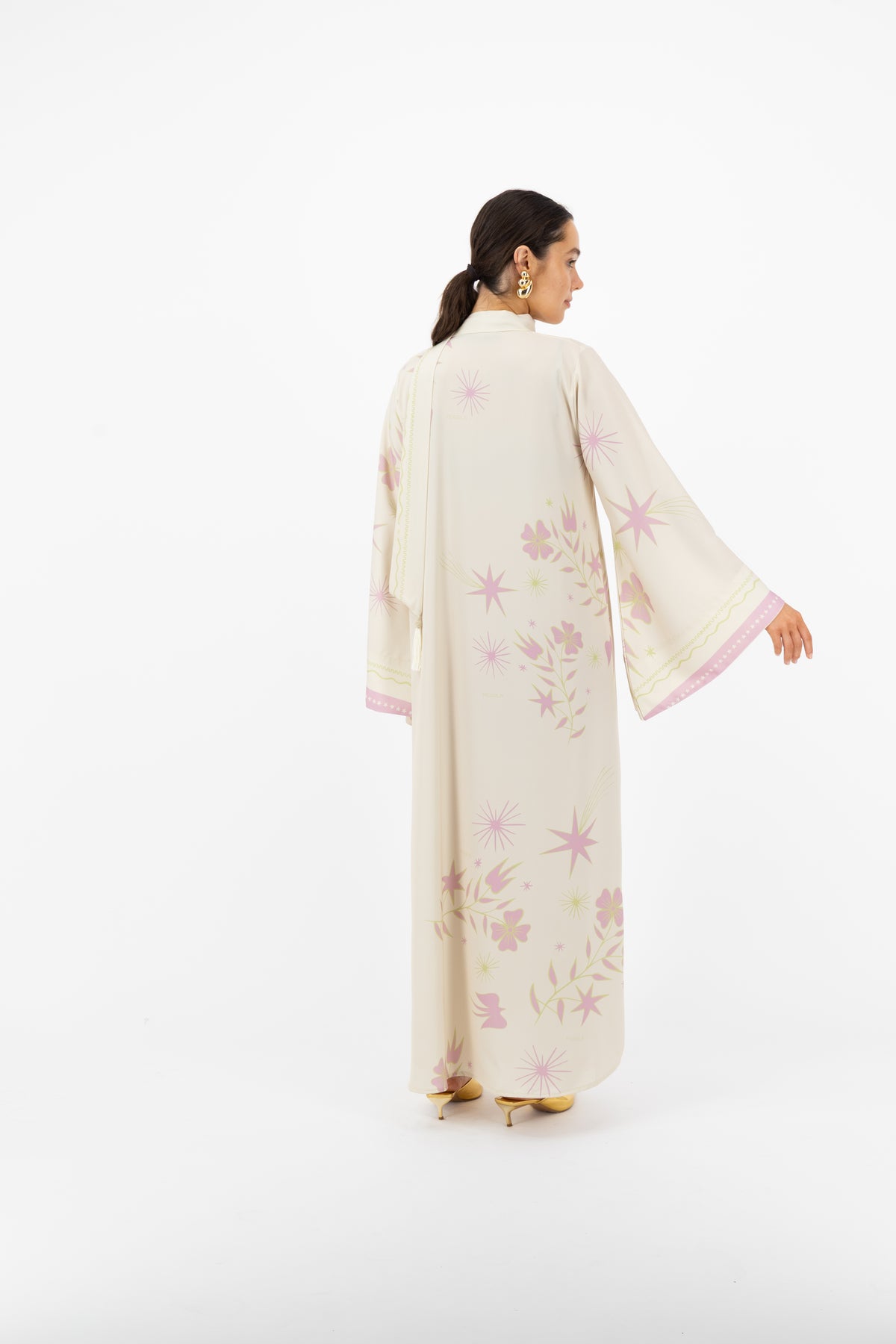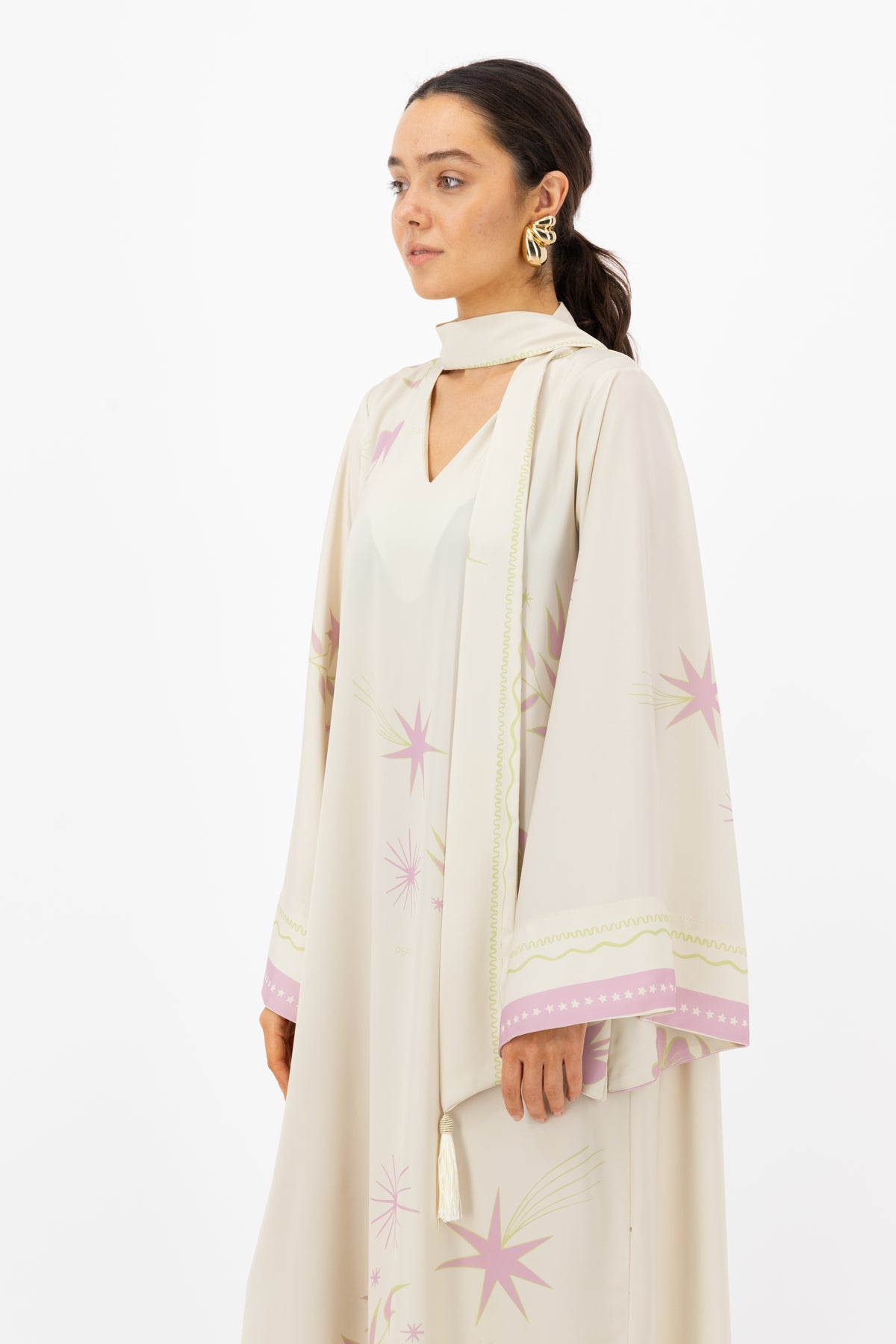 Description: Cream dress with soft pink floral and star prints, finished with an elegant tie-neck detail for a graceful, feminine look.