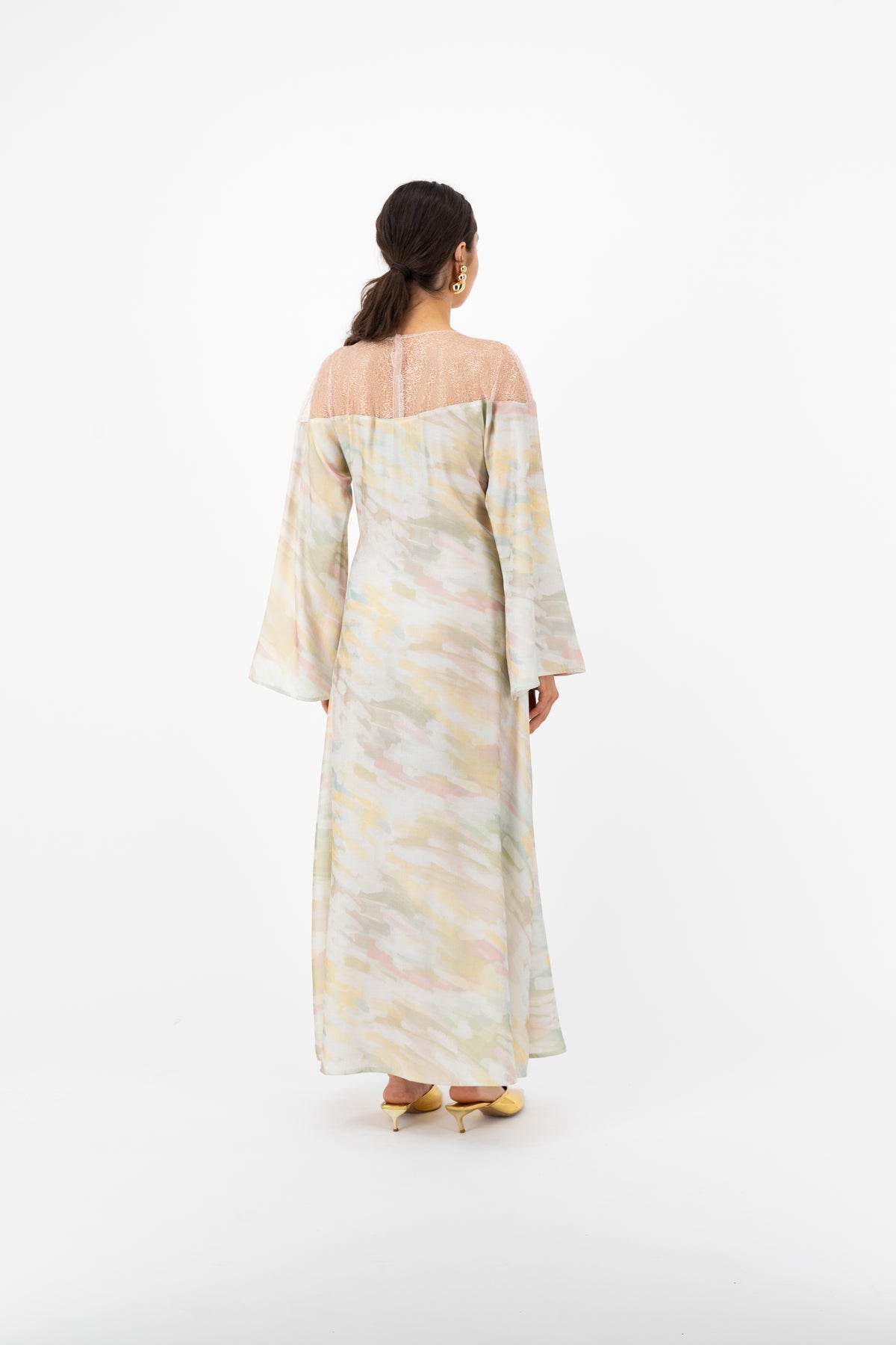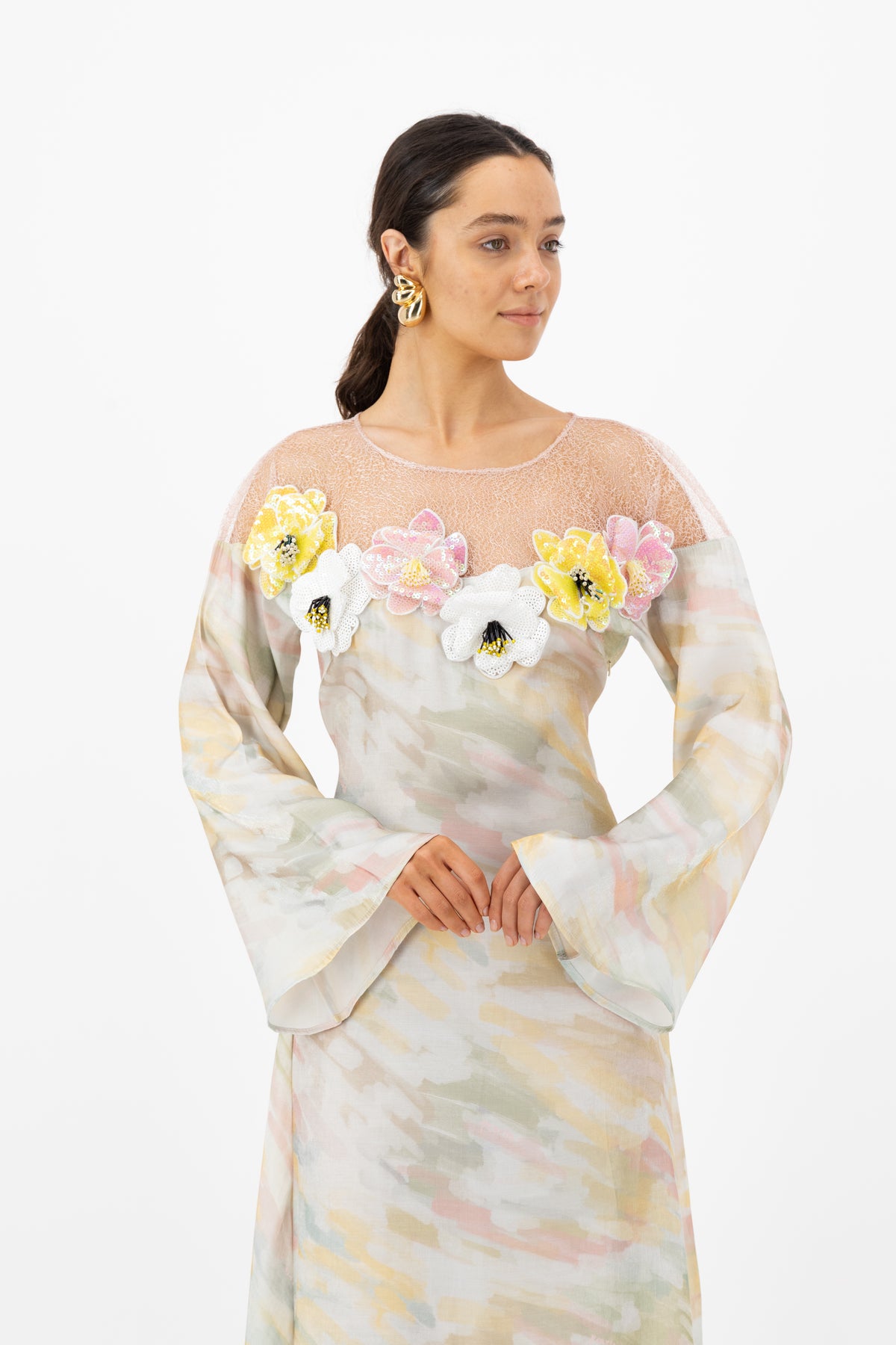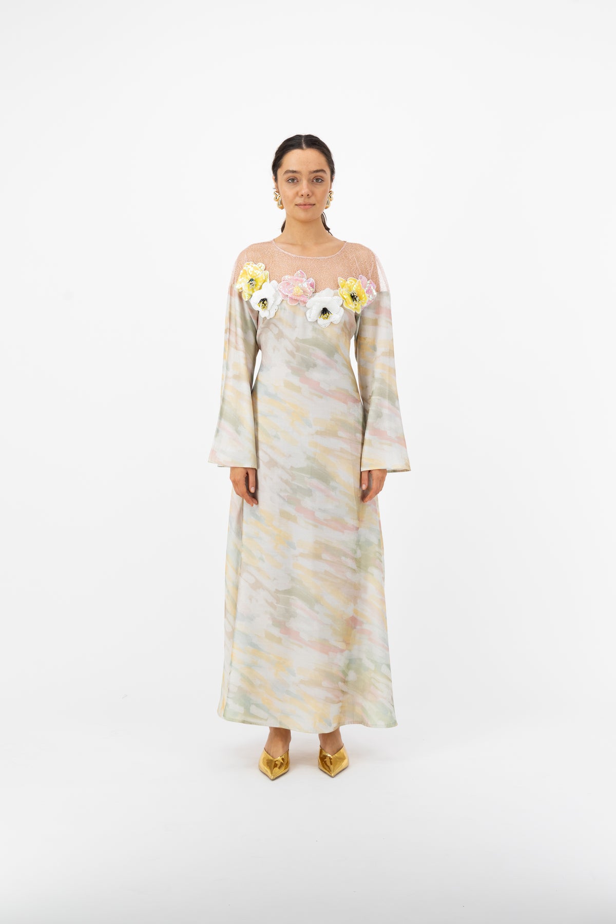 Description: A soft pastel maxi dress with flowing sleeves and vibrant 3D floral appliqués for a fresh, artistic look.