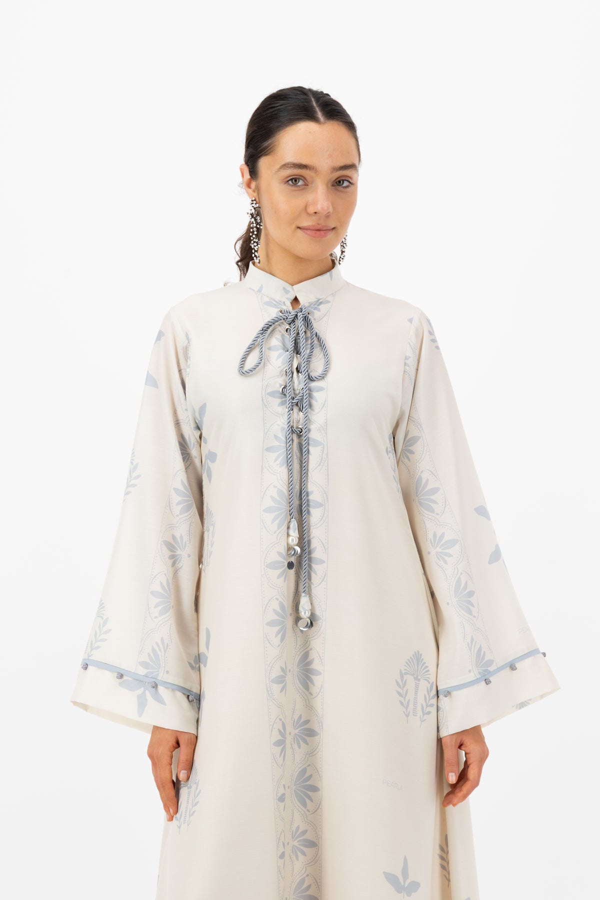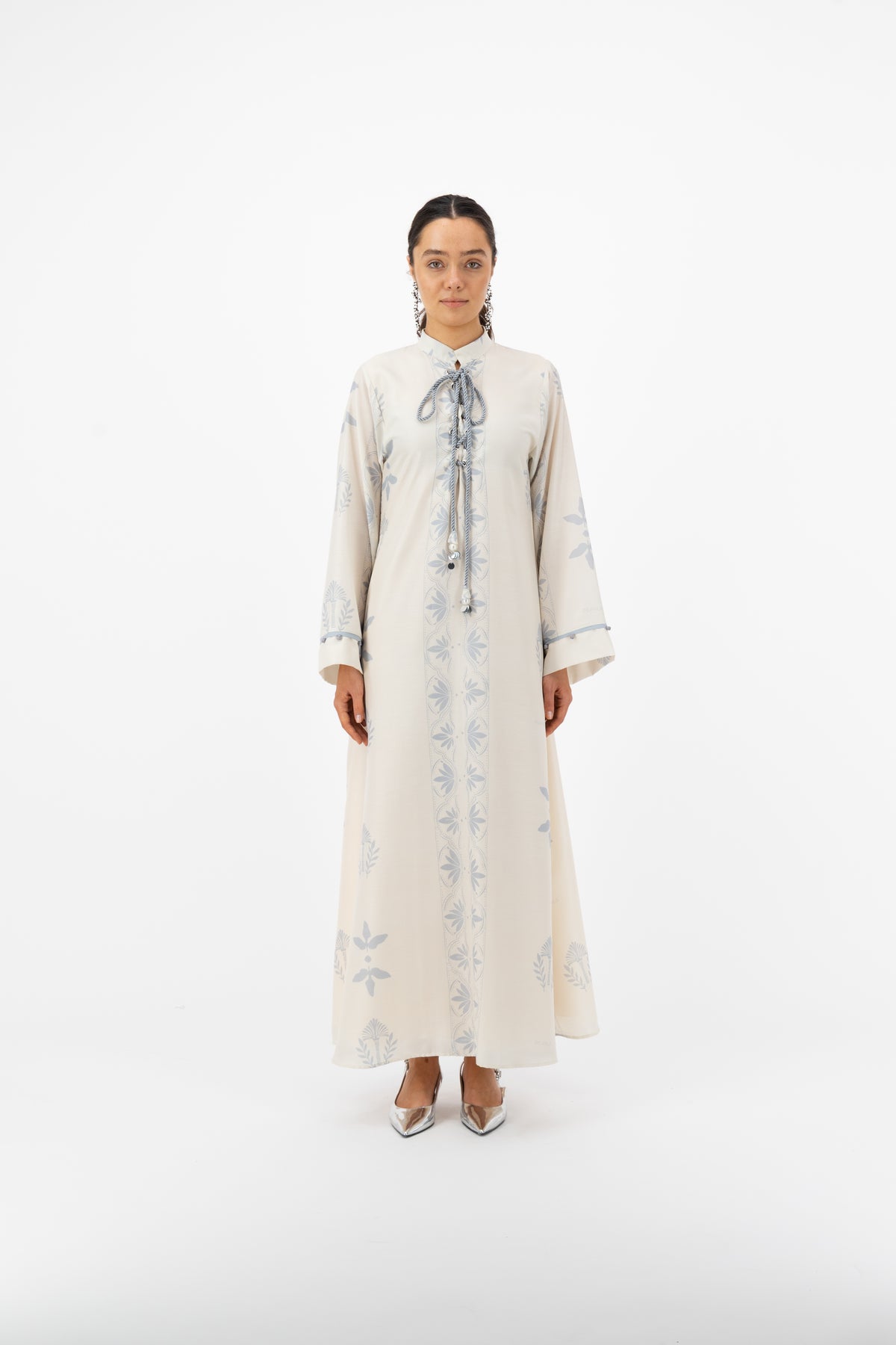 Description: An Elegant ivory kaftan with soft floral prints, a graceful flow, and a chic tie-neck detail—perfect for a refined and feminine look.