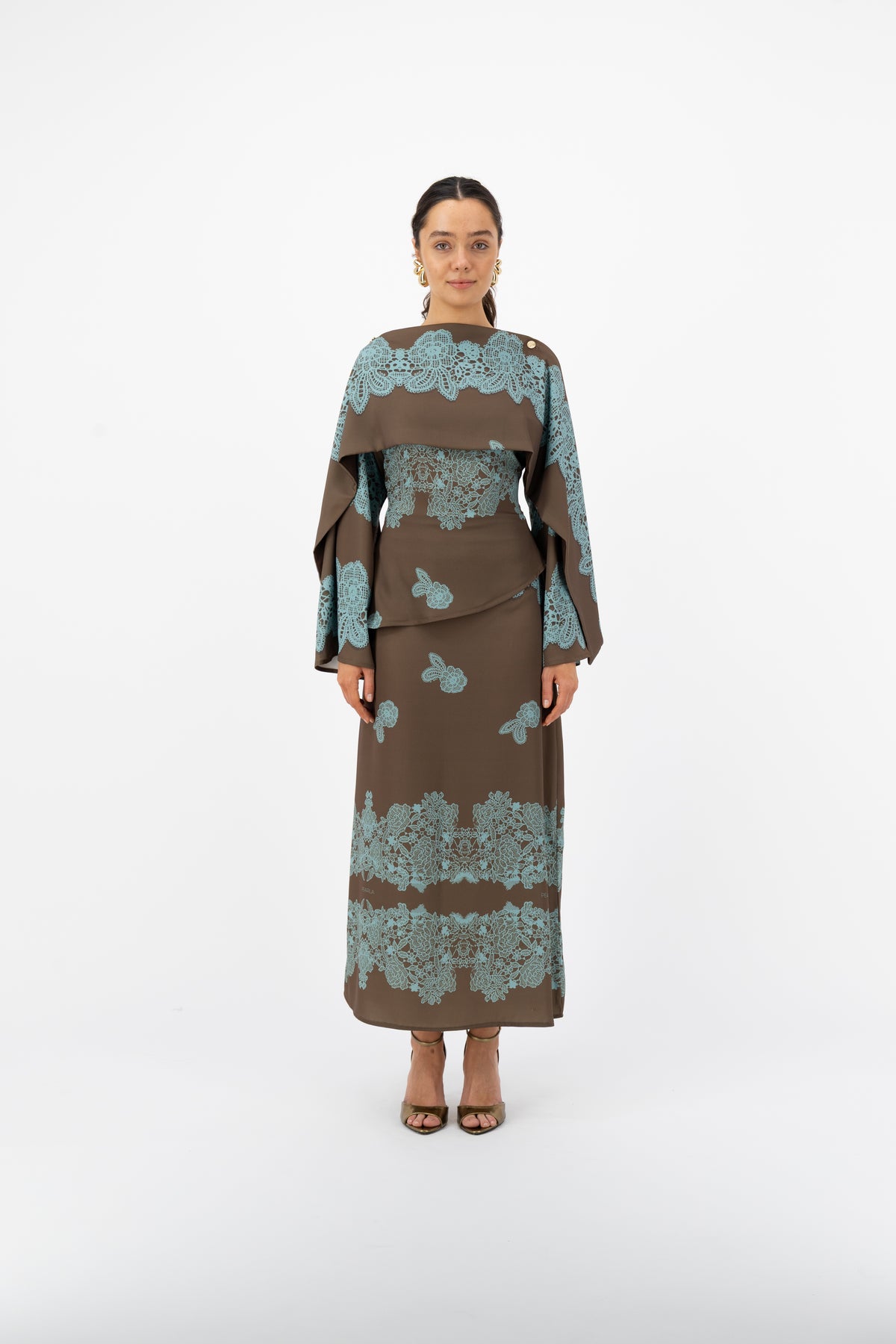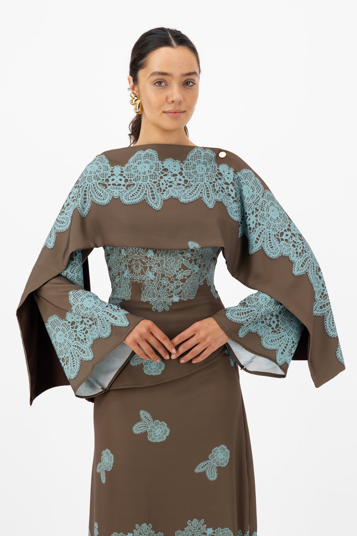 Description: A graceful taupe abaya adorned with delicate mint lace detailing along the neckline, sleeves, and hem. Elegant and refined, perfect for timeless sophistication with a soft feminine touch.