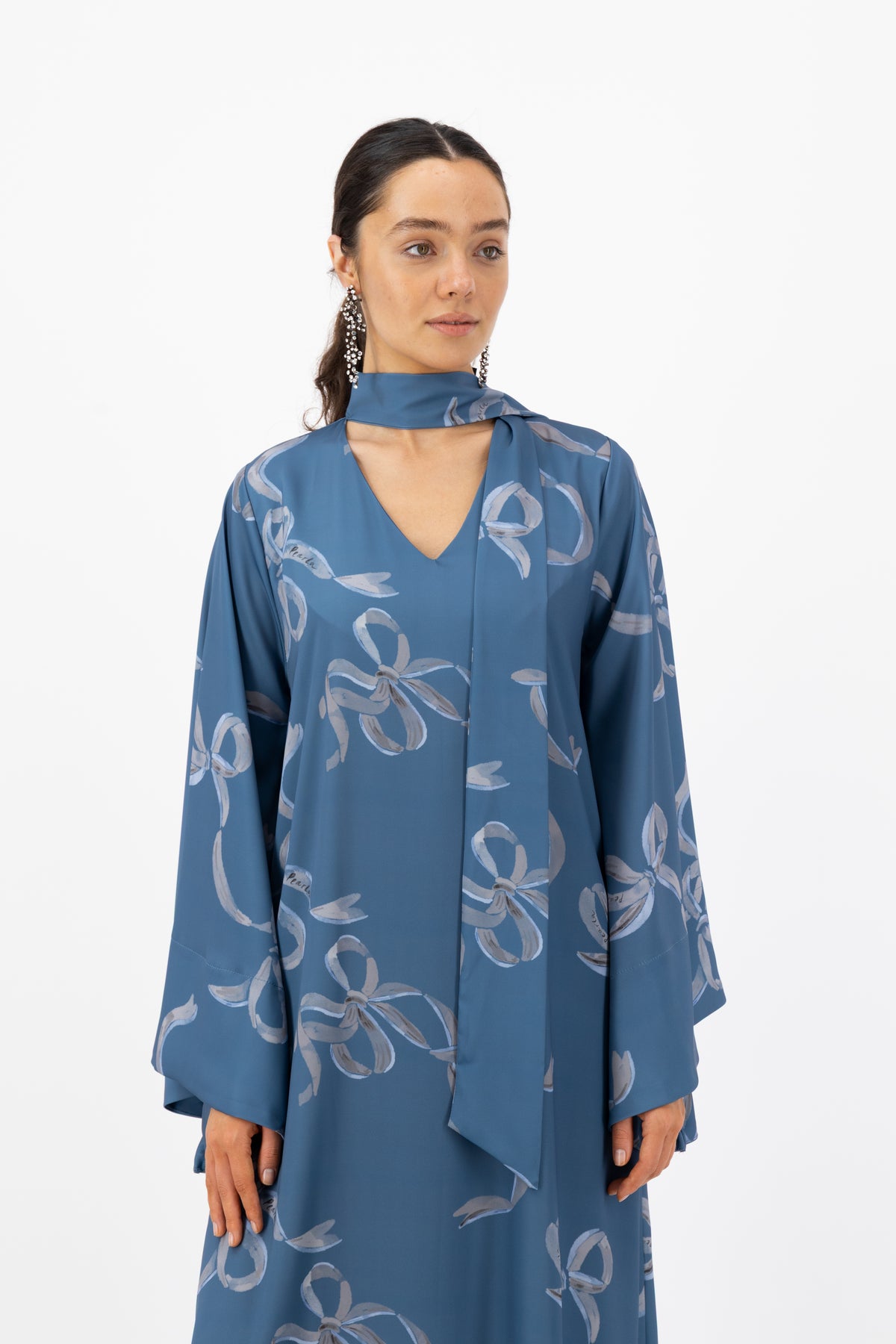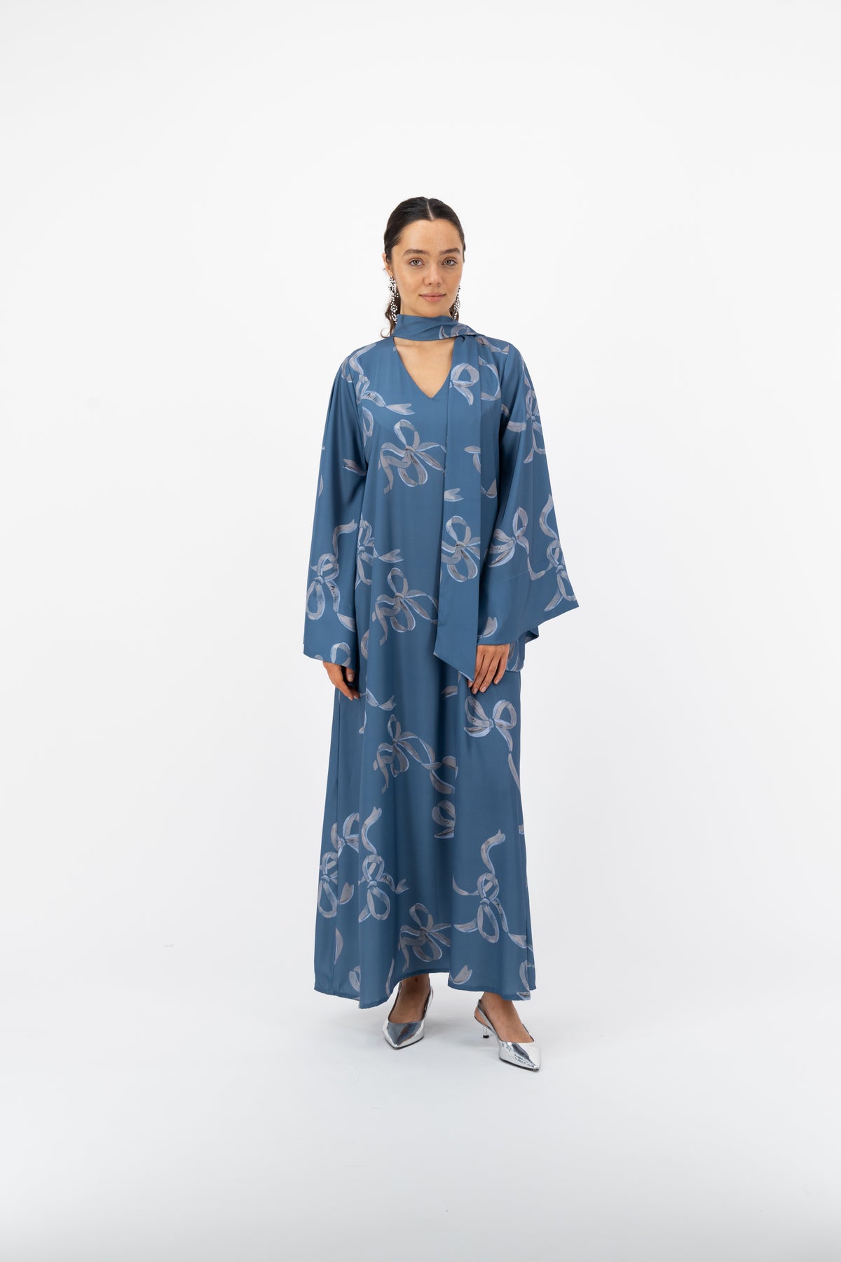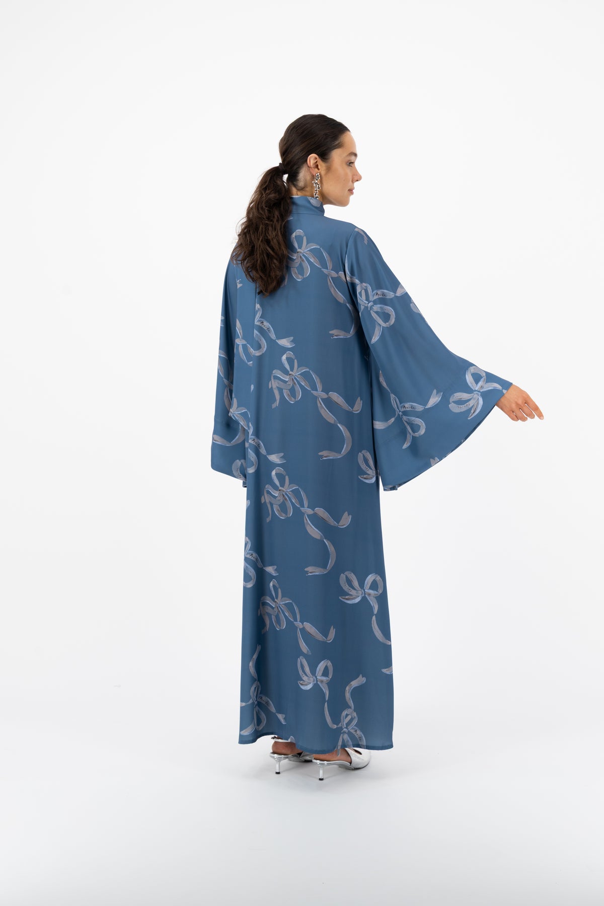 Description: A graceful blue kaftan adorned with soft ribbon-inspired prints, featuring a relaxed silhouette and lightweight fabric for an effortlessly elegant and sophisticated look.