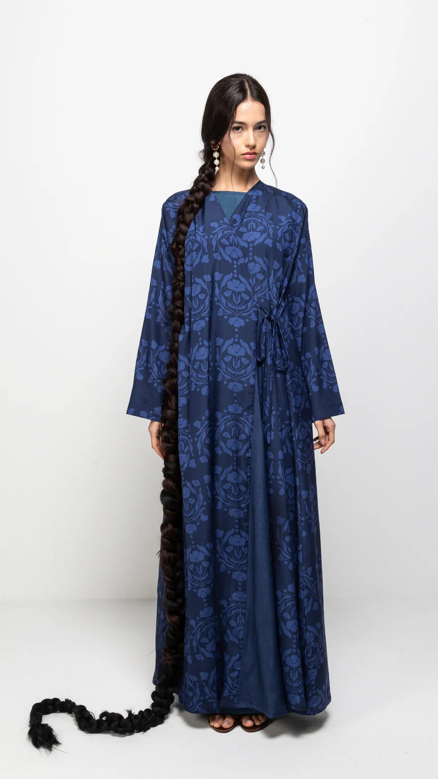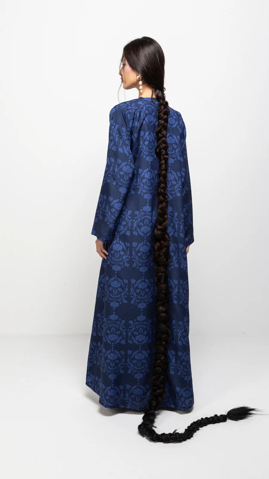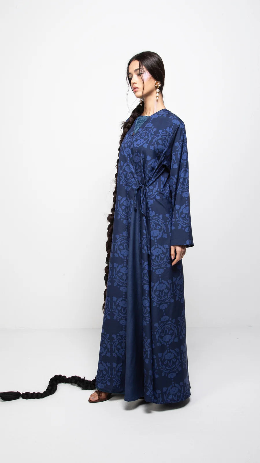 THIS ABAYA FEATURES A STUNNING FLORAL PATTERN IN VIBRANT SHADES OF BLUE AND LIGHT BLUE. THE UNIQUE DESIGN BRINGS A FRESH AND CREATIVE TOUCH, MAKING IT A BEAUTIFUL STATEMENT PIECE.