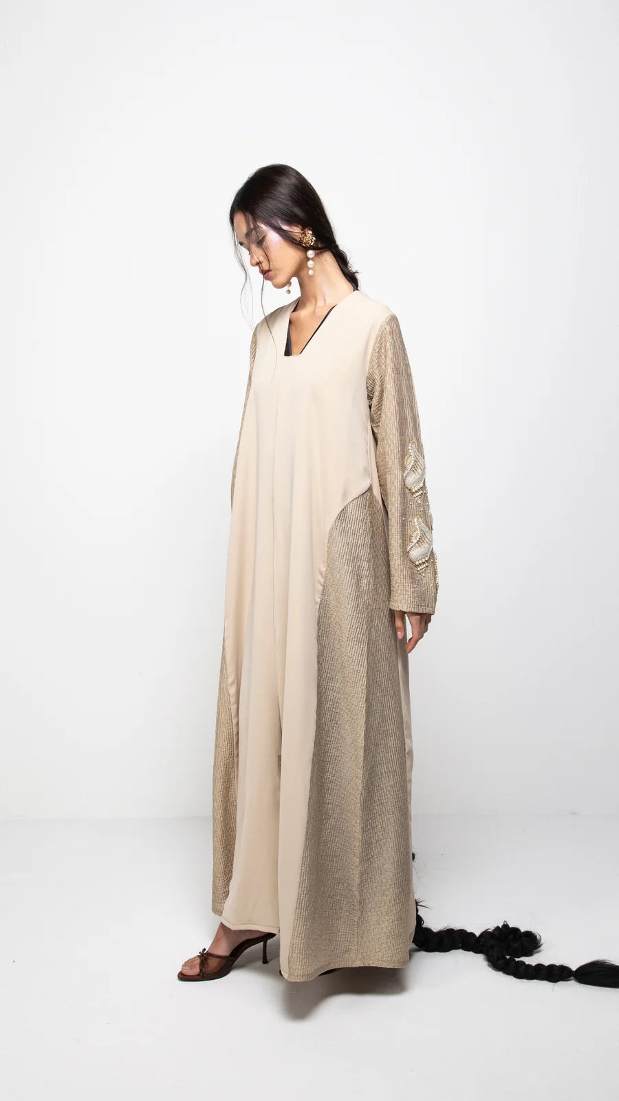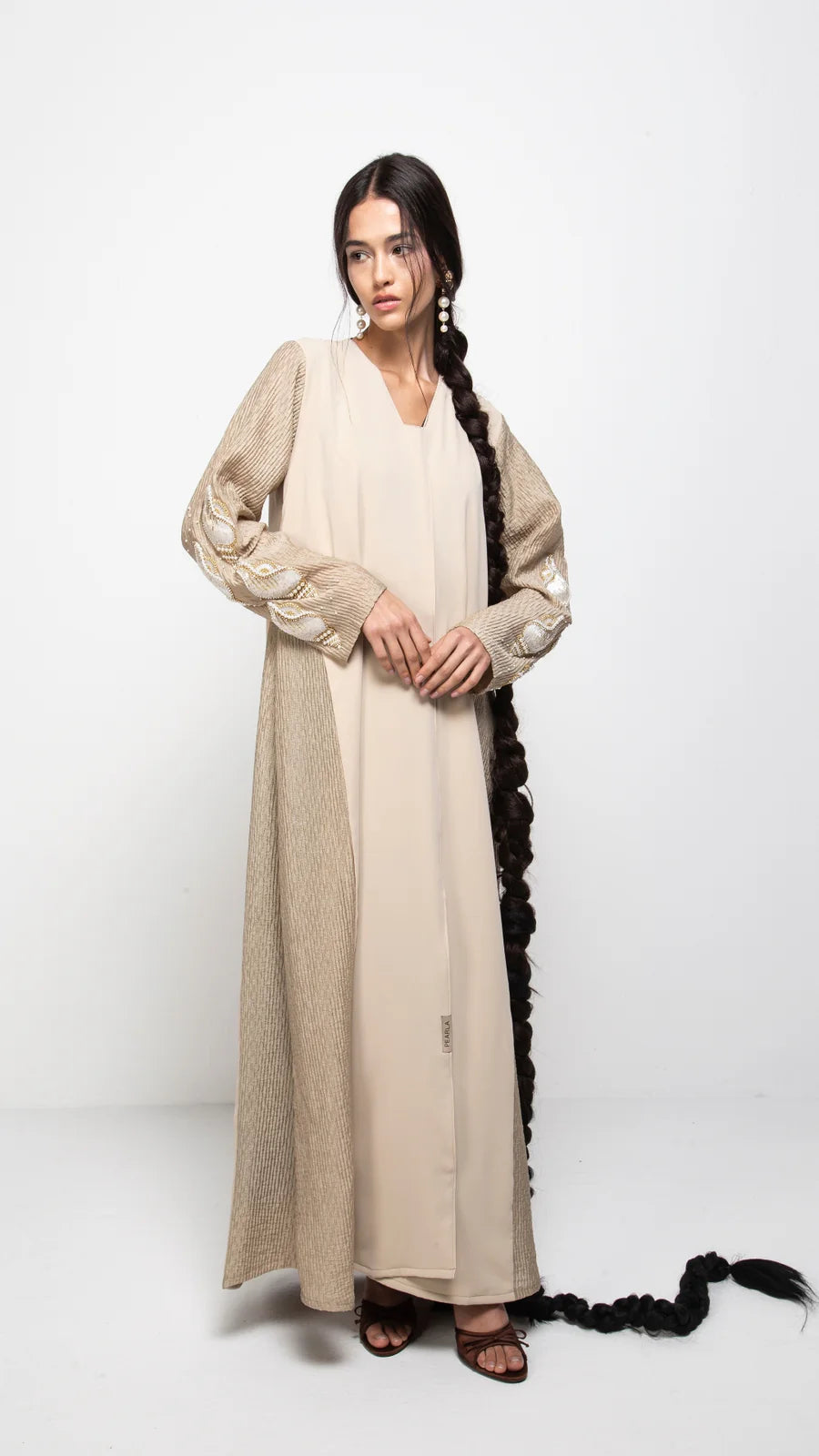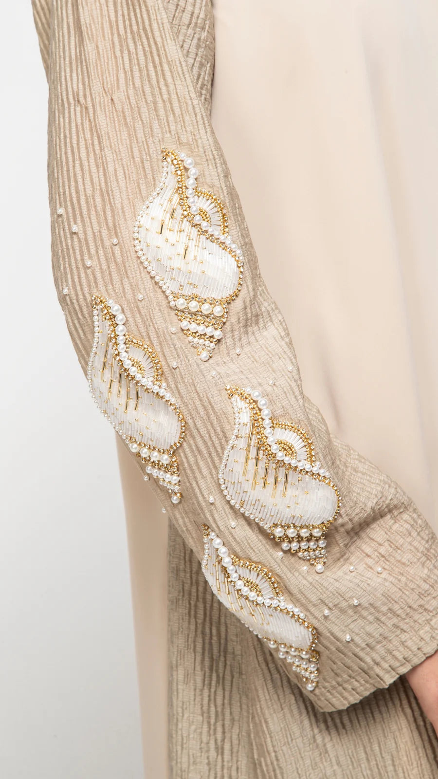 An off-white and light brown abaya with pearl and shell embroidery on the sleeves, adding a refined, delicate touch.