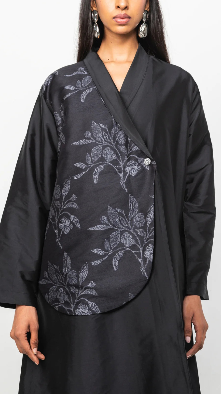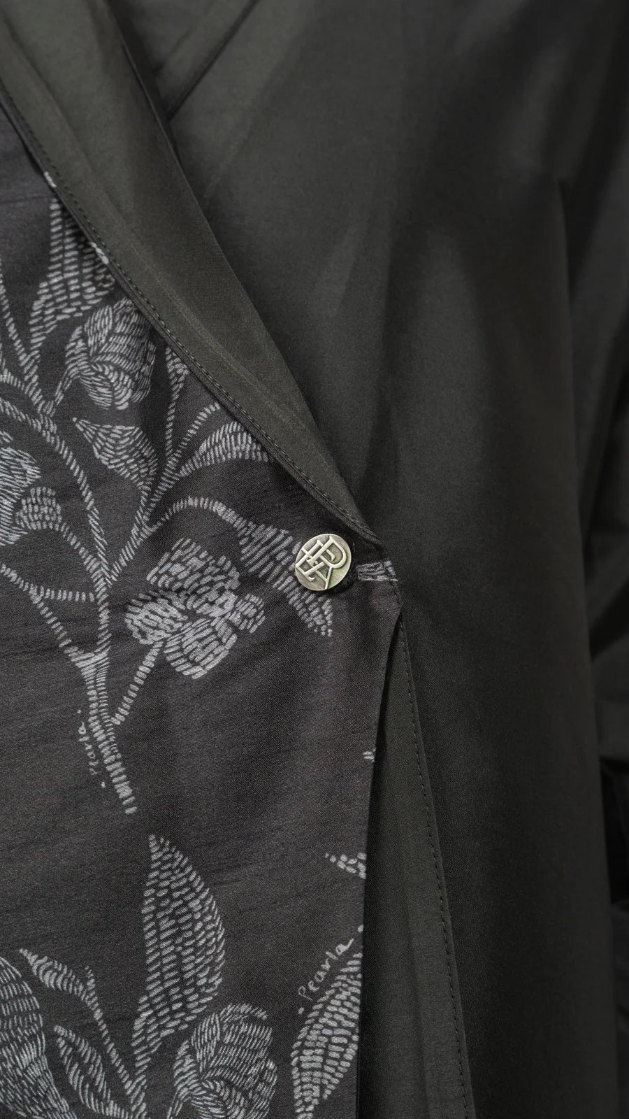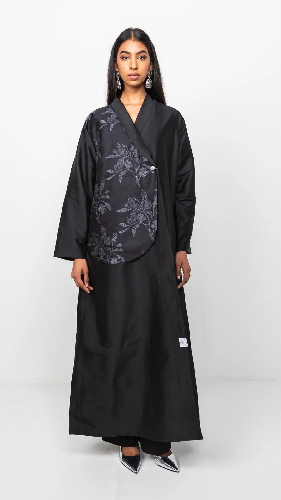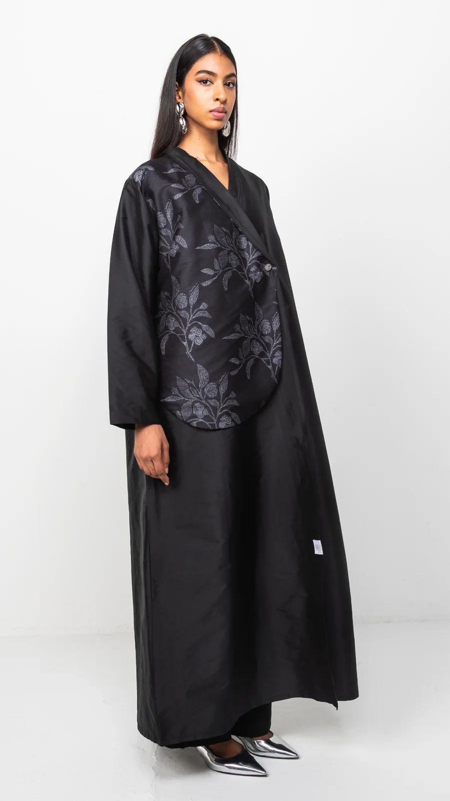 This black abaya features an asymmetrical purple floral pattern on one side, with silver button accents.