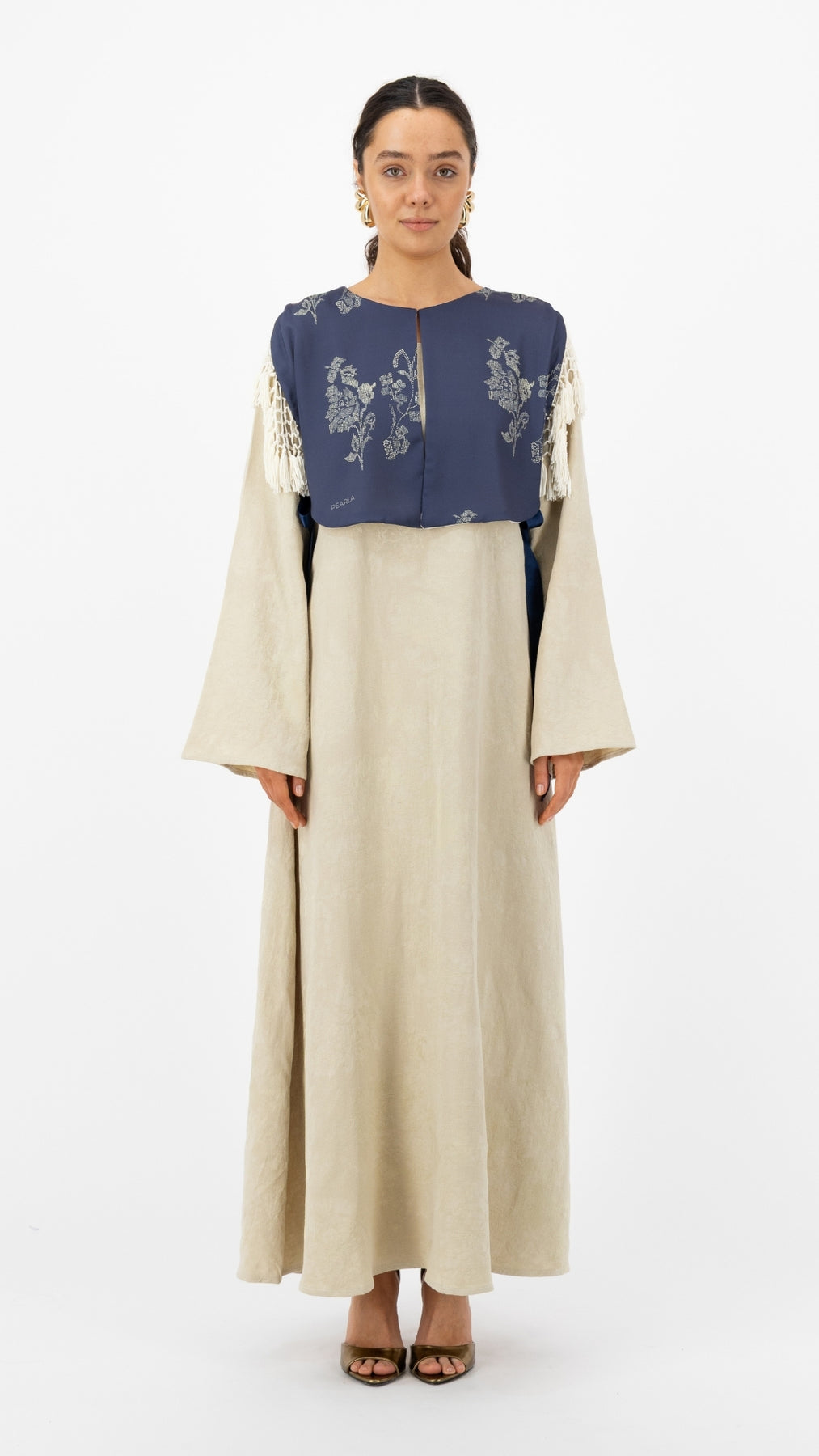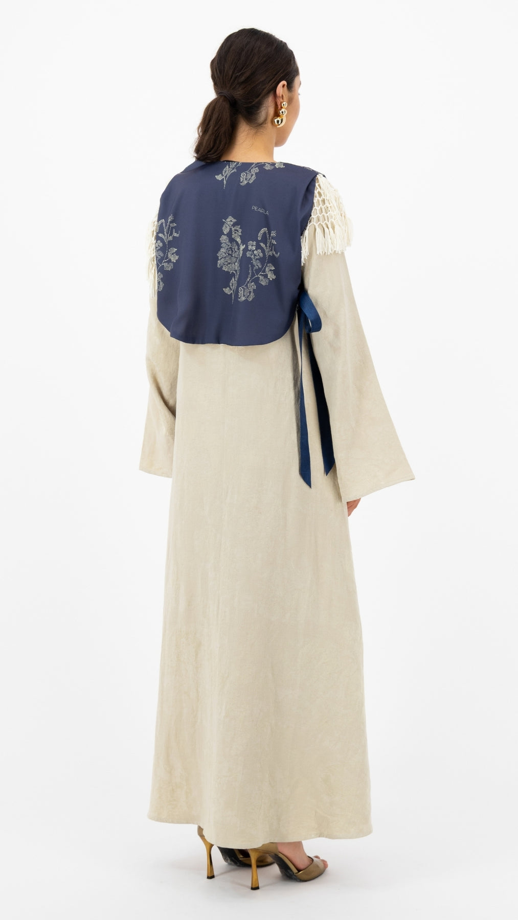 Description: : Soft sage dress layered with a navy embroidered cropped jacket, finished with delicate fringe and ribbon details for a refined, modern touch.