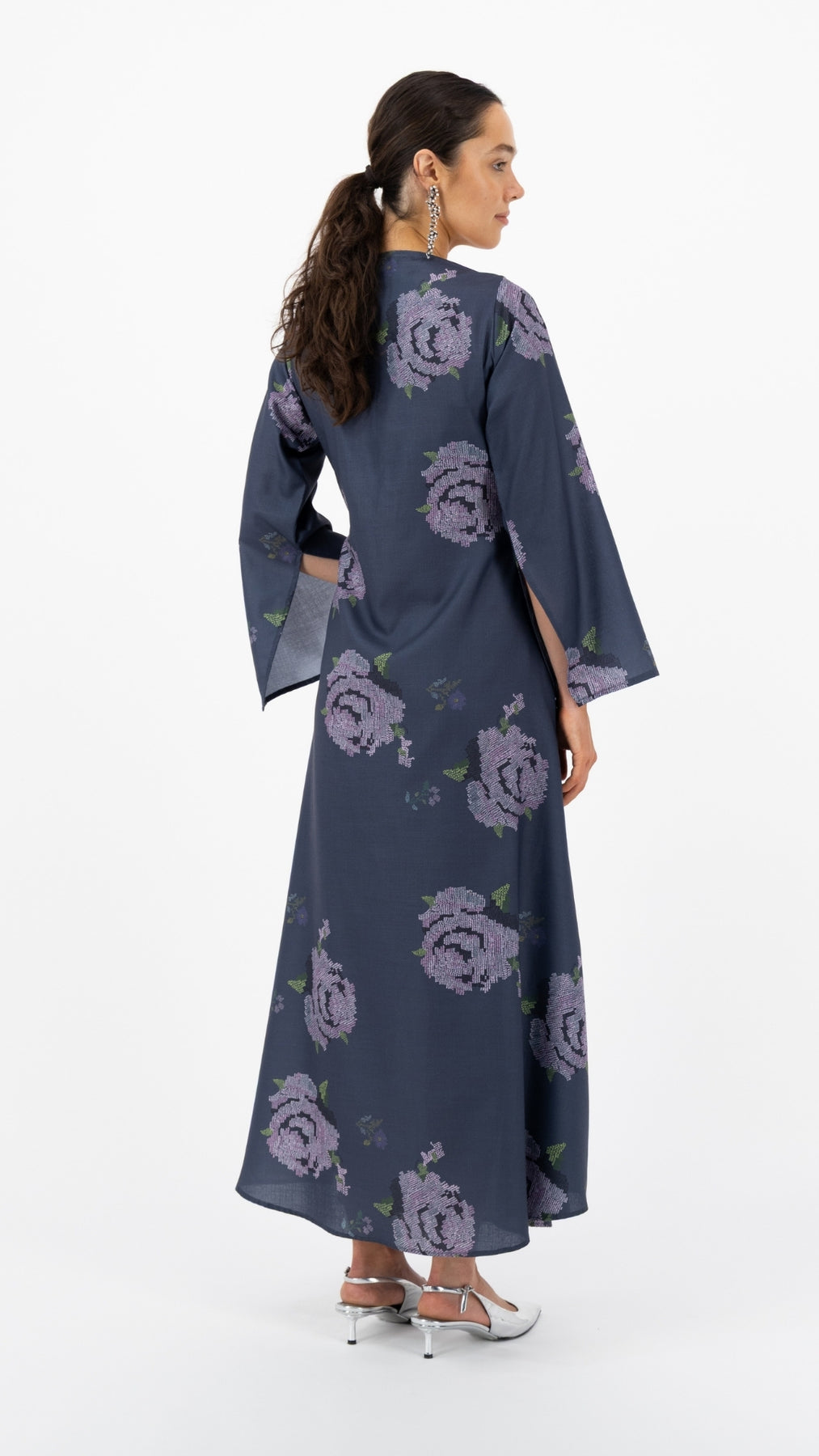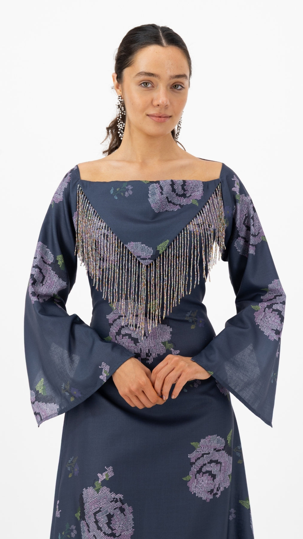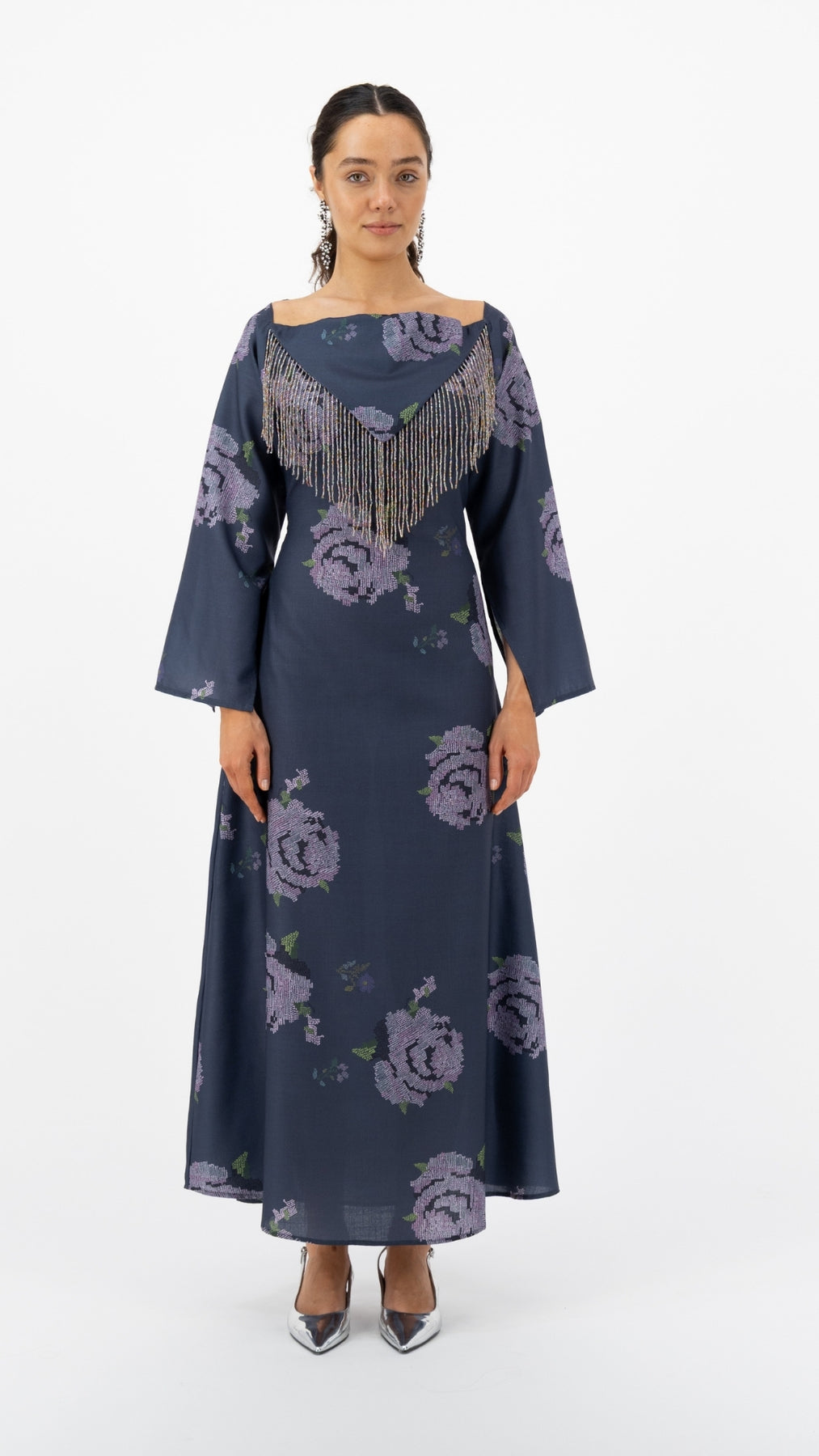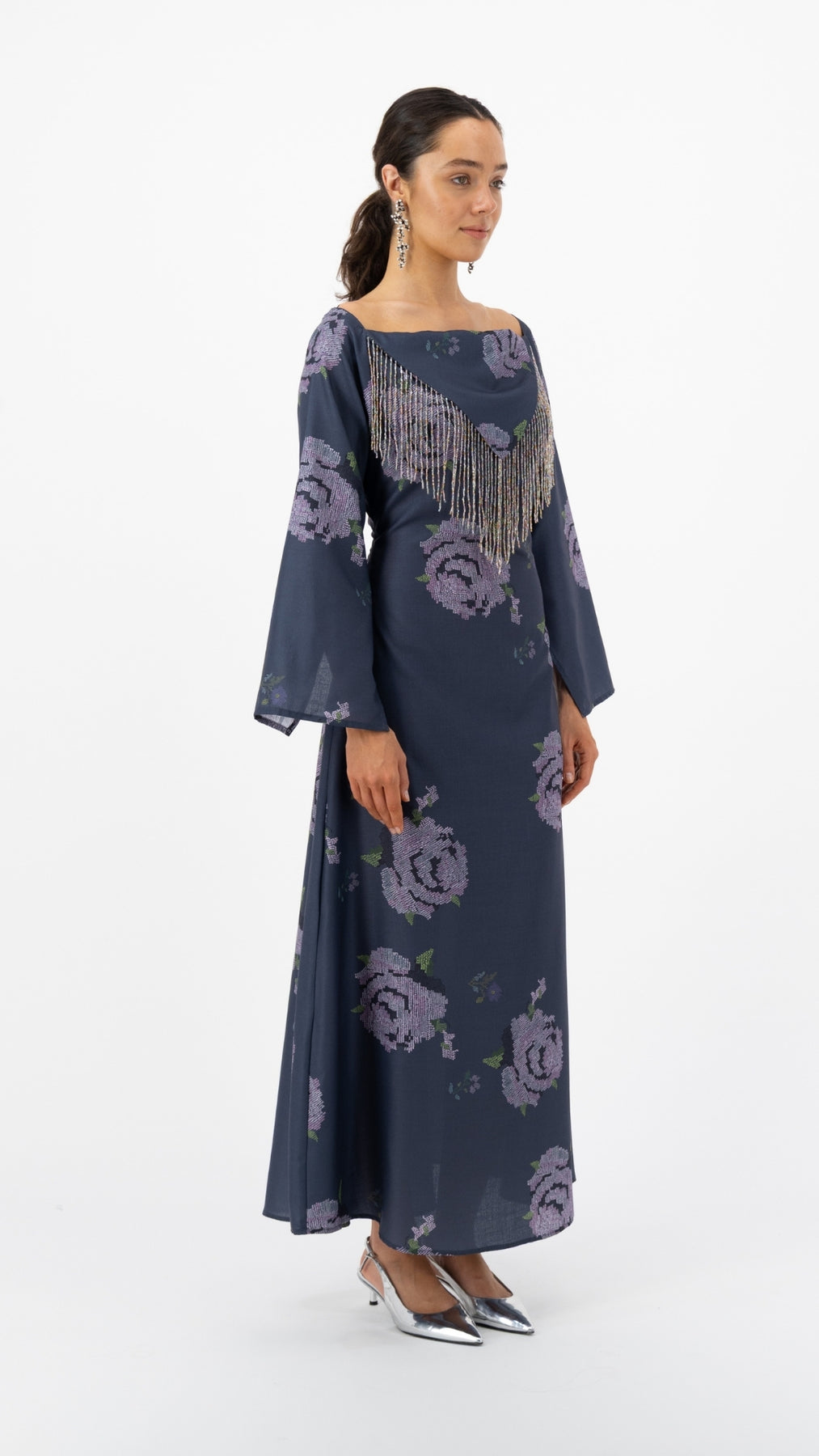 Description: Slate blue maxi dress with lavender rose prints and elegant fringe detail.